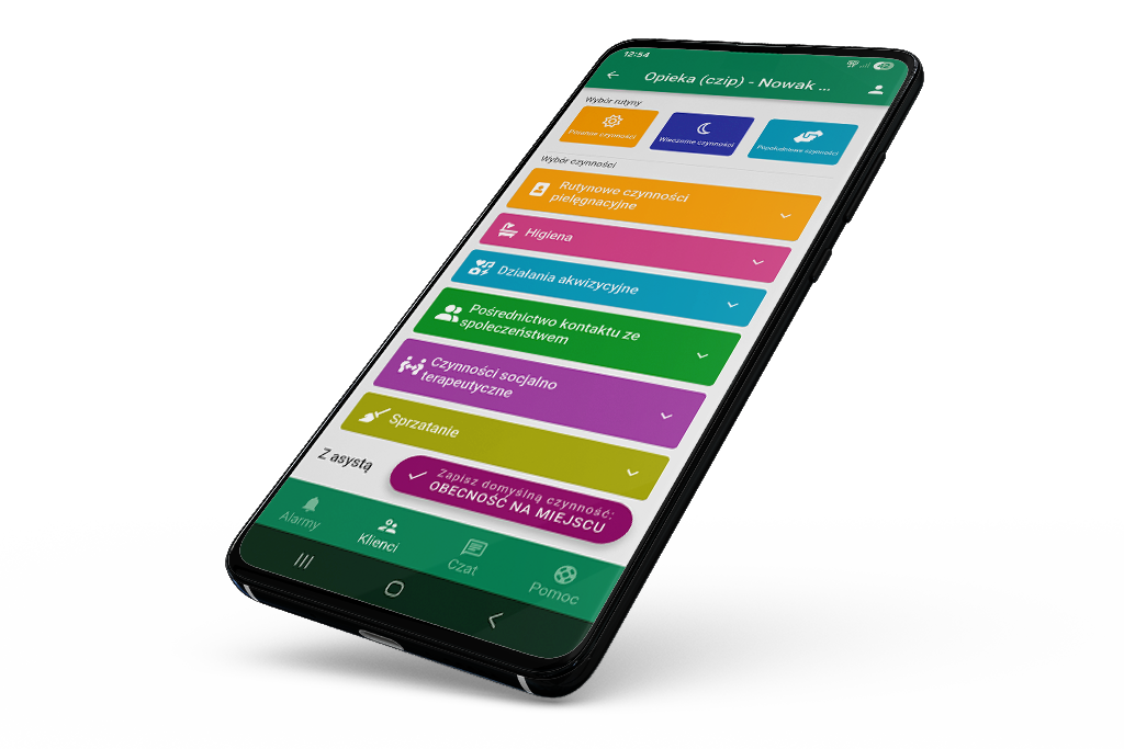 W aplikacji mobilnej znajdziesz wiele przydatnych narzędzi, z których pracownicy będą korzystać każdego dnia. Służy ona do prostego i szybkiego obsługiwania alarmów. Personel ma w aplikacji czytelną informację o tym, kto wzywa pomoc, i może przejąć alarm. Ma również dostęp do szczegółowych informacji o kliencie i aktywowanych urządzeniach. Dzięki aplikacji mobilnej można dokumentować czynności z zakresu opieki społecznej — wystarczy zeskanować chip NFC u klienta i wybrać czynności z gotowej listy. Można również planować zdarzenia, rozmawiać z kolegami przez czat i wiele więcej.